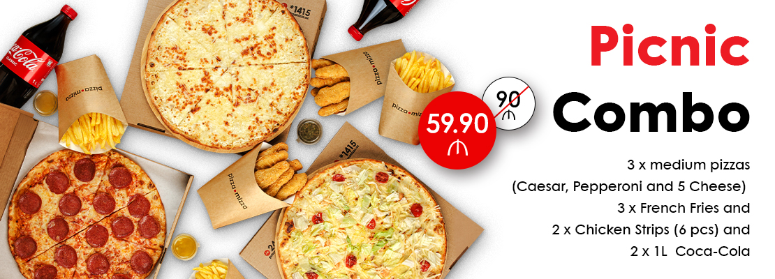 3 x medium pizzas (Caesar, Pepperoni and 5 Cheese), 3 x french fires, 2 х Chiken Strips (6 pcs.), 2 x "Coca-Cola" 1L